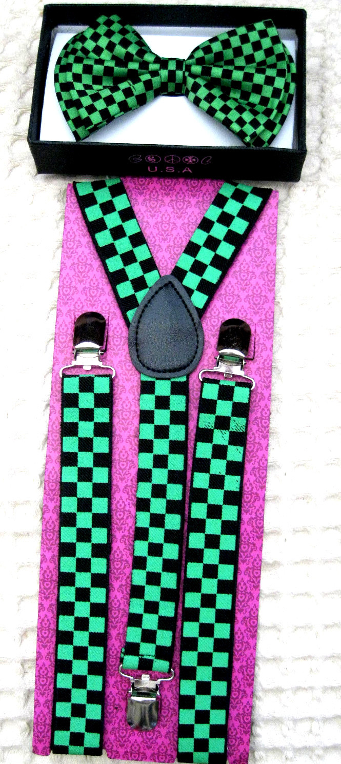 UNISEX FASHION BLACK AND GREEN CHECKERED CHECKER AJUSTABLE ALL POLYESTER SILK BOWTIE AND GREEN AND BLACK CHECKERED CHECKER SUSPENDERS COMBO-NEW IN FACTORY BOX!