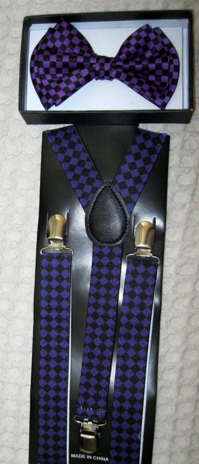 • UNISEX FASHION BLACK AND PURPLE CHECKERS CHECKERED DIAMONDS PATTERN ADJUSTABLE ALL POLYESTER SILK BOW TIE AND BLACK AND PURPLE CHECKERS CHECKERED DIAMONDS  ADJUSTABLE SUSPENDERS-NEW IN FACTORY BOX!