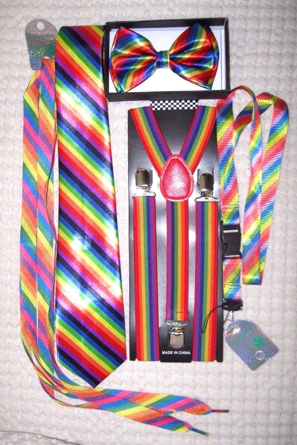 • UNISEX FASHION Rainbow-Red,Yellow ,Orange, Green, Blue, Purple Swirls ADJUSTABLE ALL POLYESTER SILK BOW TIE AND MATCHING NECK TIE, Rainbow-Red,Yellow,Orange,Green,Blue,Purple LANYARD AND Rainbow-Red,Yellow,Orange,Green,Blue,Purple Y-BACK ADJUSTABLE SUSPENDERS, AND Red,Yellow,Orange,Green,Blue,Purple  SHOELACES COMBO-NEW IN FACTORY BOX!