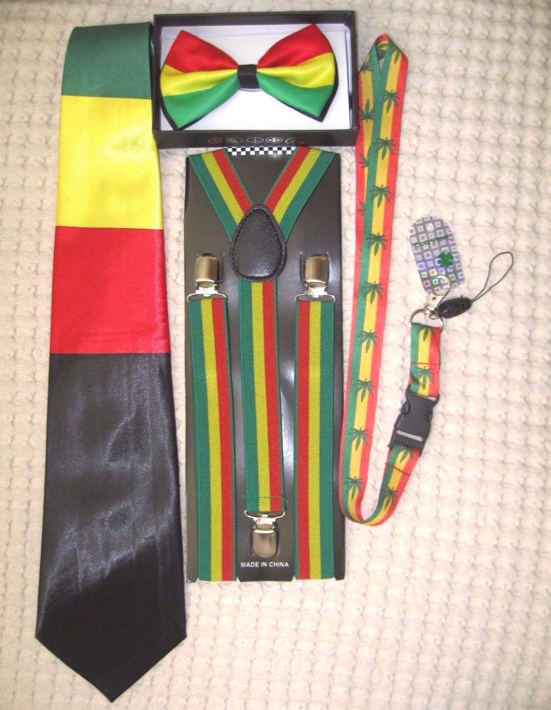 SOLID BLACK WITH RASTA STRIPES ADJUSTABLE SUSPENDERS,AND RASTA STRIPES LANYARD COMBO-NEW IN FACTORY BOX!