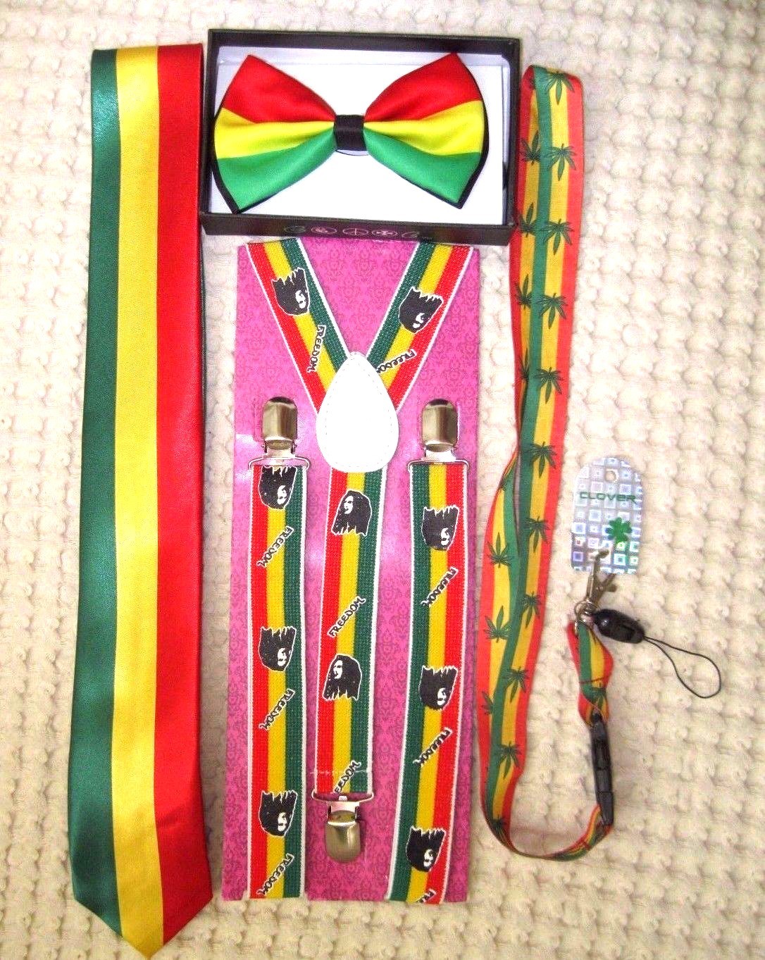 SOLID BLACK WITH RASTA STRIPES ADJUSTABLE SUSPENDERS,AND RASTA STRIPES LANYARD COMBO-NEW IN FACTORY BOX!