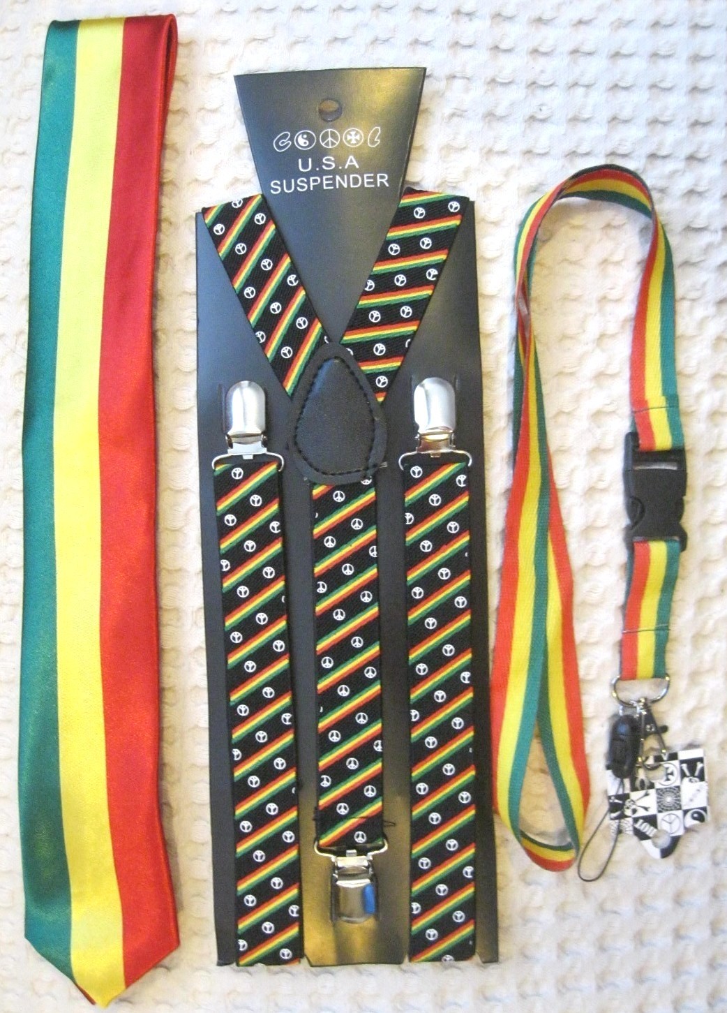 SOLID BLACK WITH RASTA STRIPES WITH WHITE PEACE SIGNS ADJUSTABLE SUSPENDERS,AND RASTA STRIPES LANYARD COMBO-NEW IN FACTORY BOX!