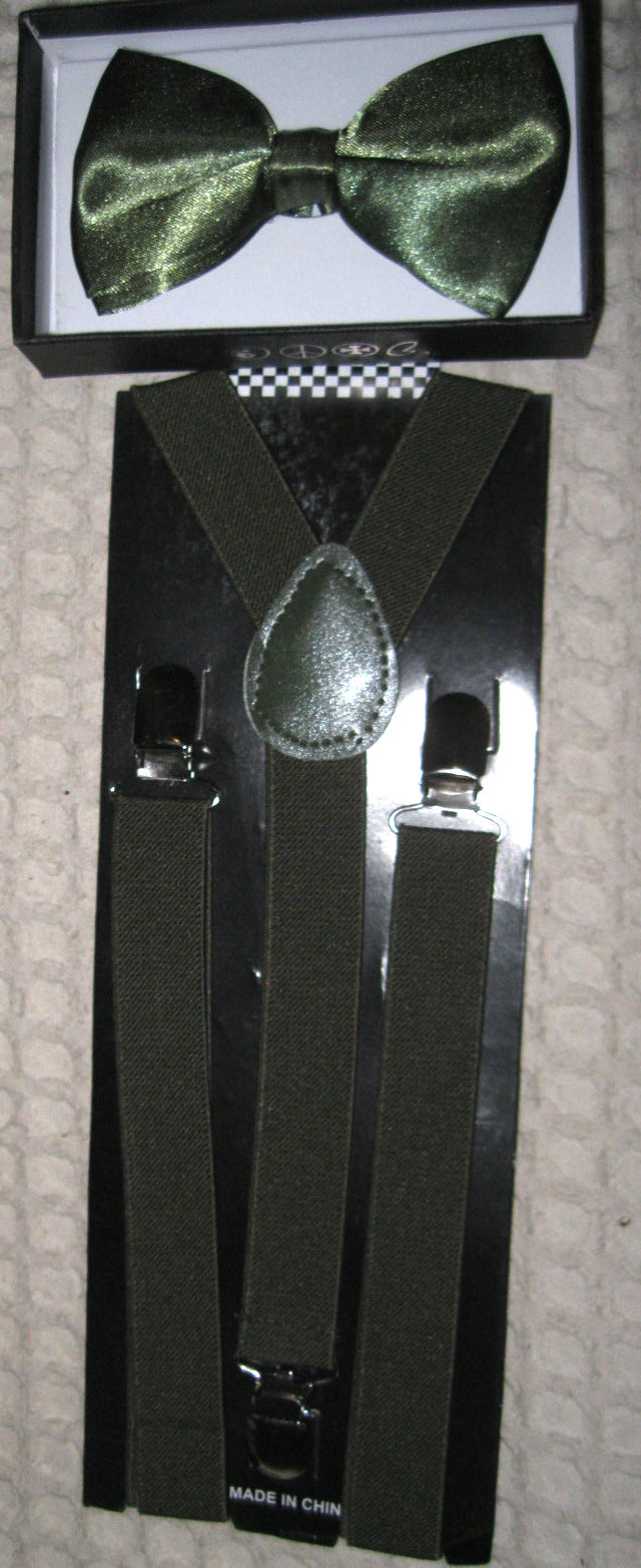 - UNISEX FASHION ST. PATRICK'S DAY ST. PATTY'S DAY SHINY SOLID NAVY ARMY GREEN ADJUSTABLE ALL POLYESTER SILK BOW TIE AND SOLID NAVY ARM SHINY GREEN SUSPENDERS COMBO-NEW IN FACTORY BOX!