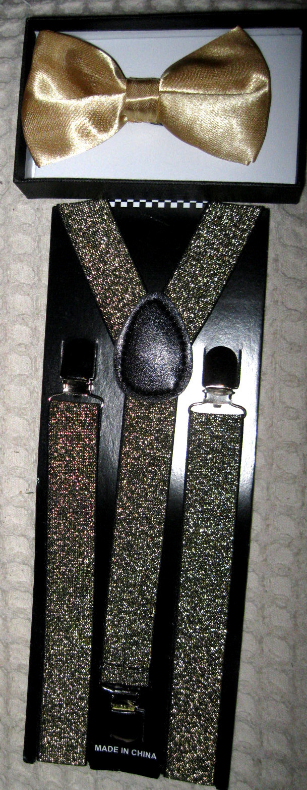 • UNISEX FASHION SOLID SHINY GOLD ADJUSTABLE ALL POLYESTER SILK BOW TIE AND SOLID TAN/BEIGE GLITTERED SUSPENDERS COMBO-NEW IN FACTORY BOX!