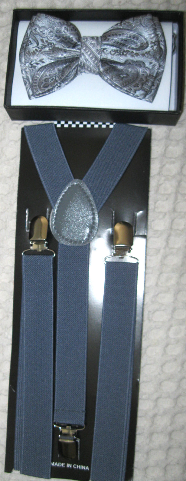 UNISEX FASHION SILVER GRAY GREY PAISLEY PATTERN ADJUSTABLE ALL POLYESTER SILK BOW TIE AND SILVER GRAY GREY ADJUSTABLE SUSPENDERS-NEW IN FACTORY BOX!