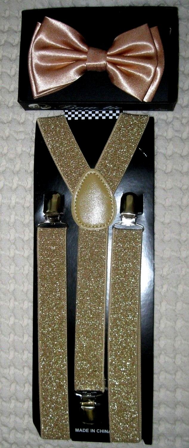 • UNISEX FASHION CHAMPAIGN GOLD ADJUSTABLE ALL POLYESTER SILK BOW TIE AND CHAMPAIGN GOLD GLITTER GLITTERED SUSPENDERS Y-BACK COMBO-NEW IN FACTORY BOX!