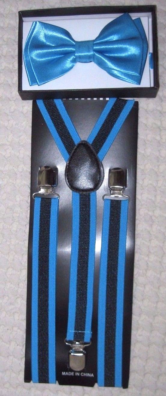 UNISEX FASHION FRENCH BLUE ADJUSTABLE ALL POLYESTER SILK BOW TIE AND BLACK AND FRENCH BLUE ADJUSTABLE Y-BACK SUSPENDERS COMBO-NEW IN FACTORY BOX!