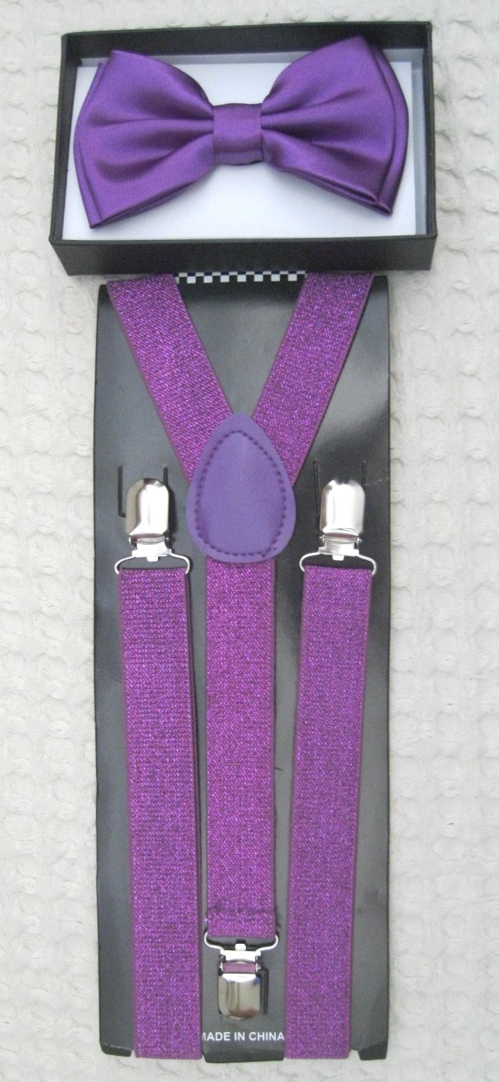 - UNISEX FASHION PURPLE ADJUSTABLE ALL POLYESTER SILK BOW TIE AND SOLID NEON PURPLE GLITTERED SUSPENDERS COMBO-NEW IN FACTORY BOX!