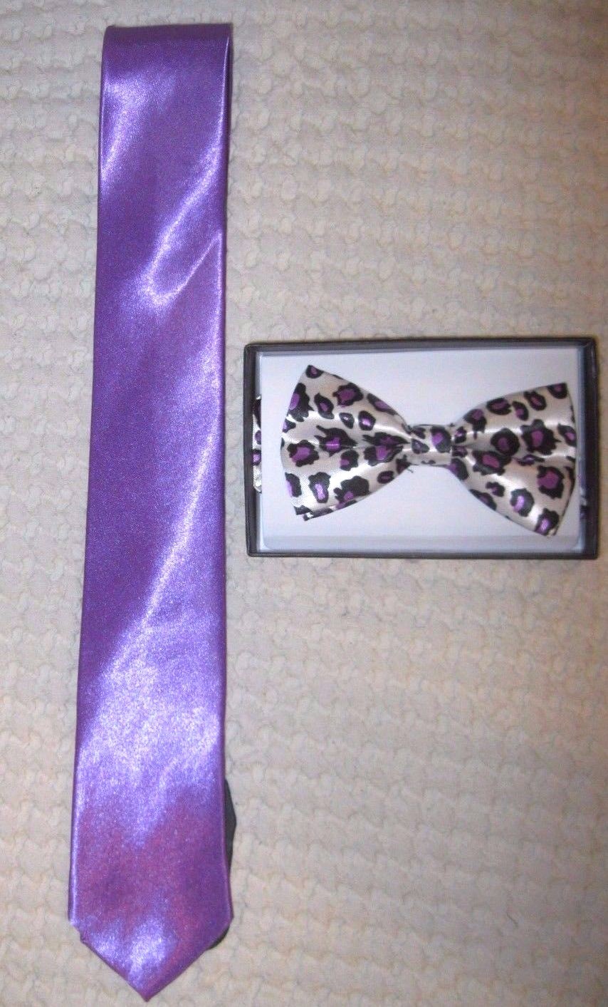 • UNISEX FASHION SOLID NECK TIE and PURPLE LEOPARD CHEETAH ANIMAL PRINT ADJUSTABLE ALL POLYESTER SILK BOW TIE COMBO-NEW IN FACTORY BOX!
