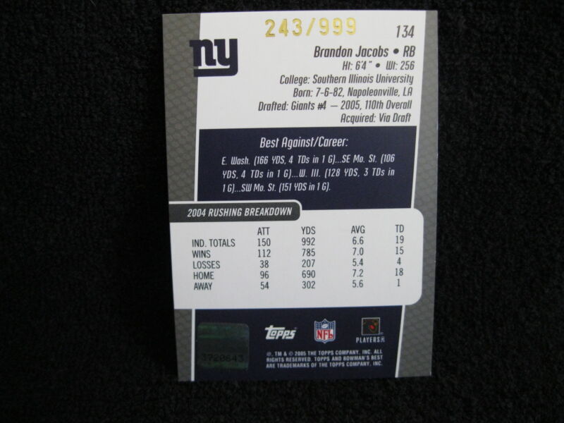 The item you are buying an authentic PREMIERE BOWMAN BEST RARE HOLOGRAM ROOKIE AUTOGRAPH #ED 243/999 CARD of BRANDON JACOBS ROOKIE CARD FROM 2005 BOWMAN BEST. These rare ROOKIE HOLOGRAM AUTOGRAPH card is Authenticated by BOWMAN BEST,NUMBERED TO ONLY 243/999, please see scan for details!