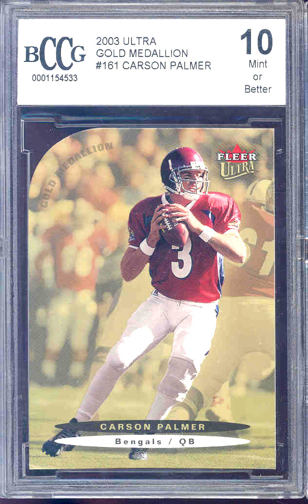 The item you are buying an authentic FLEER ULTRA GOLD MEDALLION ROOKIE CARD#161 GRADED MINT-GEM MINT BCCG 10 ON THE CARD OF CARSON PALMER FROM 2003 FLEER ULTRA. This GOLD MEDALLION ROOKIE Card is Authenticated by FLEER ULTRA,GRADED MINT-GEM MINT BCCG 10 ON THE CARD BY BECKETT GRADING SERVICE, please see scan for details!