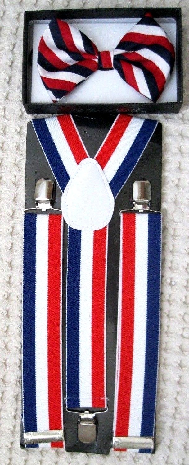 •UNISEX FASHION RED,WHITE, AND BLUE US PATRIOTIC STIPES ADJUSTABLE ALL POLYESTER SILK BOW TIE AND MATCHING RED,WHITE, AND BLUE STRIPES 1 1/2" ADJUSTABLE Y-BACK SUSPENDERS COMBO-NEW IN FACTORY BOX!