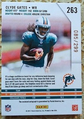 CLYDE GATES ROOKIE (MIAMI DOLPHINS-WR) PANINI ROOKIES AND STARS 4-COLOR MIAMI DOLPHINS LOGO PATCH AND AUTOGRAPH ROOKIE CARD#263 FROM 2011 PANINI ROOKIES AND STARS FOOTBALL NUMBERED TO 085 OF 299 MADE!!!