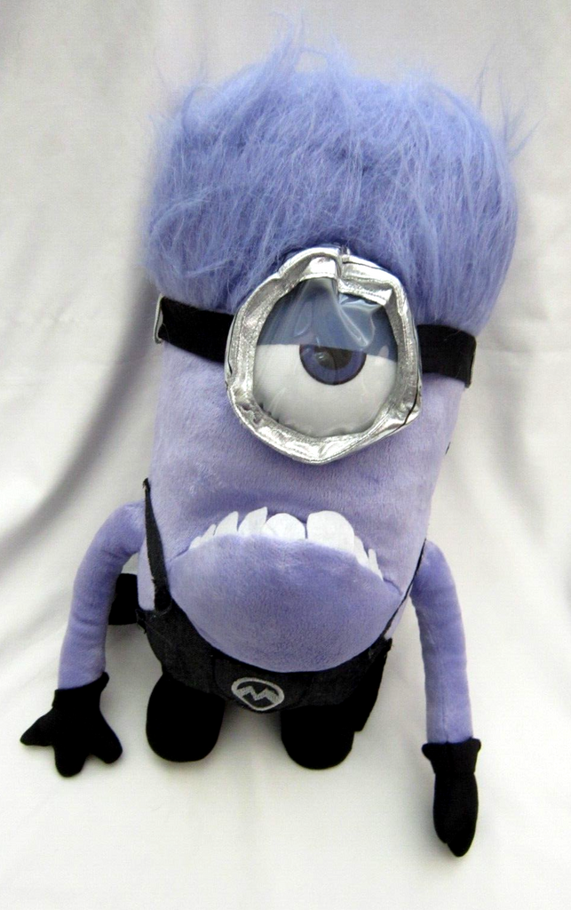Stuffed evil Minion features a soft purple body, crazy hair and crooked teeth; wears the standard henchman One Eye goggles and uniform Stash small stuff in the back zip pocket