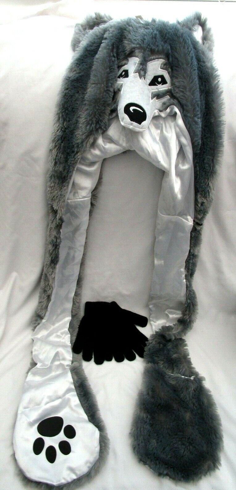 Halloween Gray Wolf Snood Beanie Plush Hat 11" x 43" Hoodie Beanie with hand warmers and Black Knitted Gloves-New without Tags!