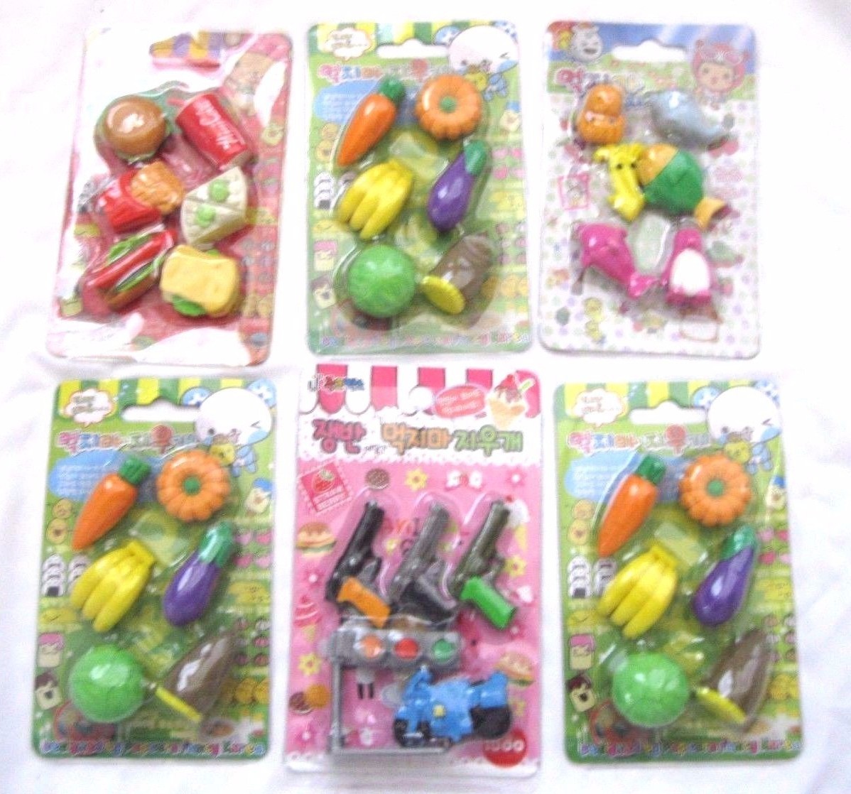 6 IWAKO JAPANESE/POPCORN FANCY KOREA DINNER ITEMS,FOOD,DRINKS,VEGETABLES, FISH, MOTORCYCLES,GUNS AND MORE ERASERS PACKAGES (6 ERASERS PER PACKAGE FOR A TOTAL OF 36 ERASERS), #1 BRAND IN THE WORLD, COLLECTIBLE.(V12)