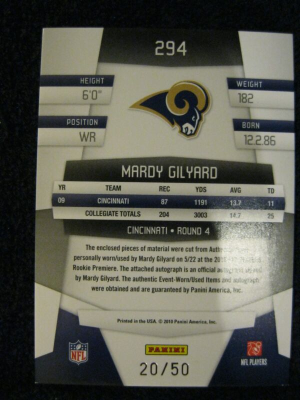 MARDY GILYARD ROOKIE (ST. LOUIS RAMS-WR)RARE PRIME 3 COLOR SHOE/JERSEY PATCH/BALL  AUTOGRAPHED MIRROR BLUE CARD#294 FROM 2010 LEAF CERTIFED FOOTBALL NUMBERED TO 20 OF 50 EVERY MADE!