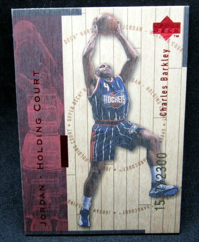 MICHAEL JORDAN (CHICAGO BULLS-GUARD GOAT HOF SUPERSTAR) AND CHARLES BARKLEY (HOUSTON ROCKETS-FORWARD GOAT HOF) 1998-99 UPPER DECK HARDCOURT NUMBERED 1537/2300 WOODEN JORDAN HOLDING COURT PREMIERE CARD WHICH MAY BE NEAR-MINT OR BETTER CONDITION SINCE IT CAME DIRECT FROM A PACK TO A TOPLOADER!!