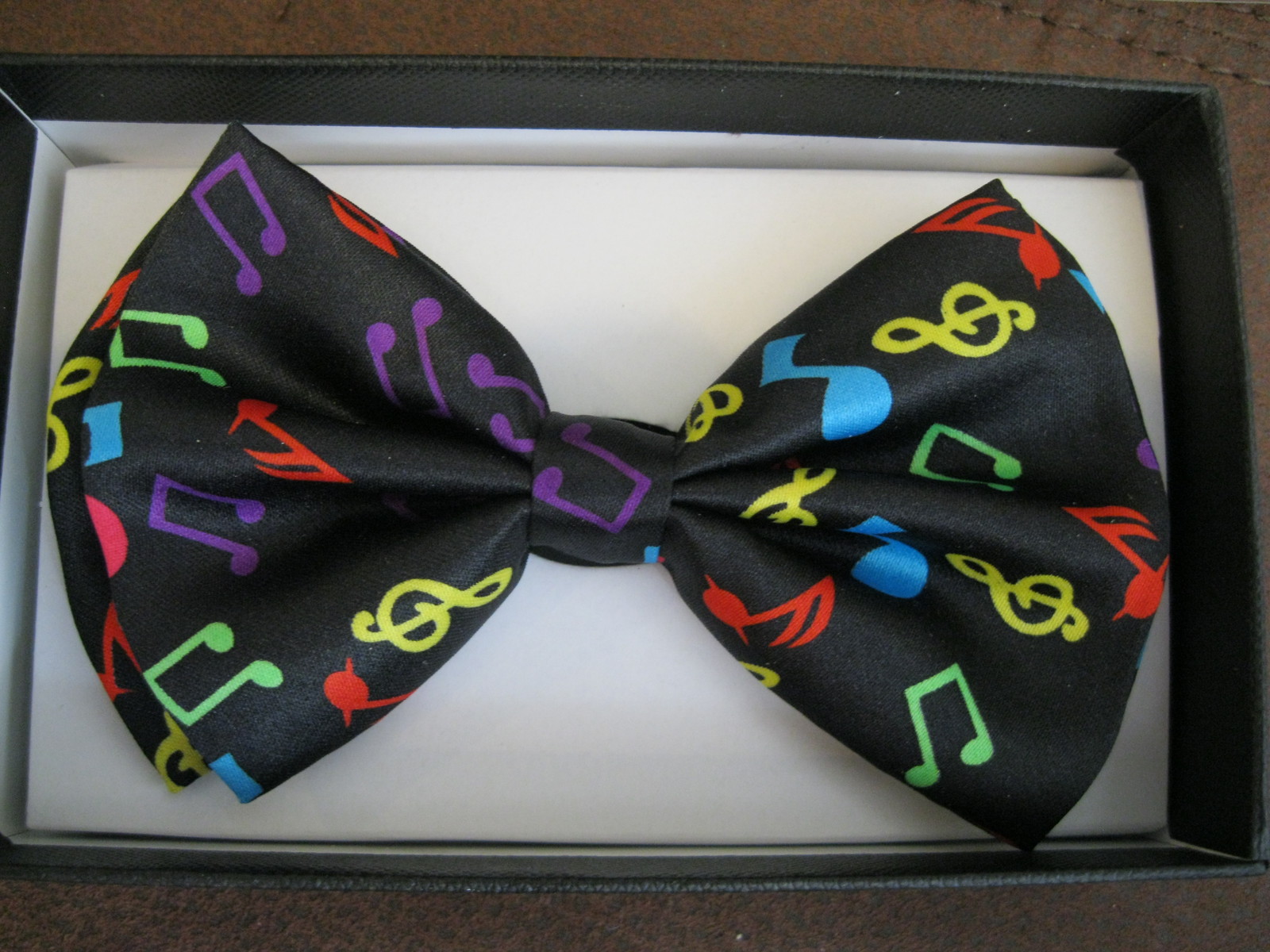 - UNISEX FASHION MULTI COLORED MUSICAL NOTES ADJUSTABLE ALL POLYESTER SILK PRE-TIED STRAP BOW TIE-NEW IN FACTORY BOX!