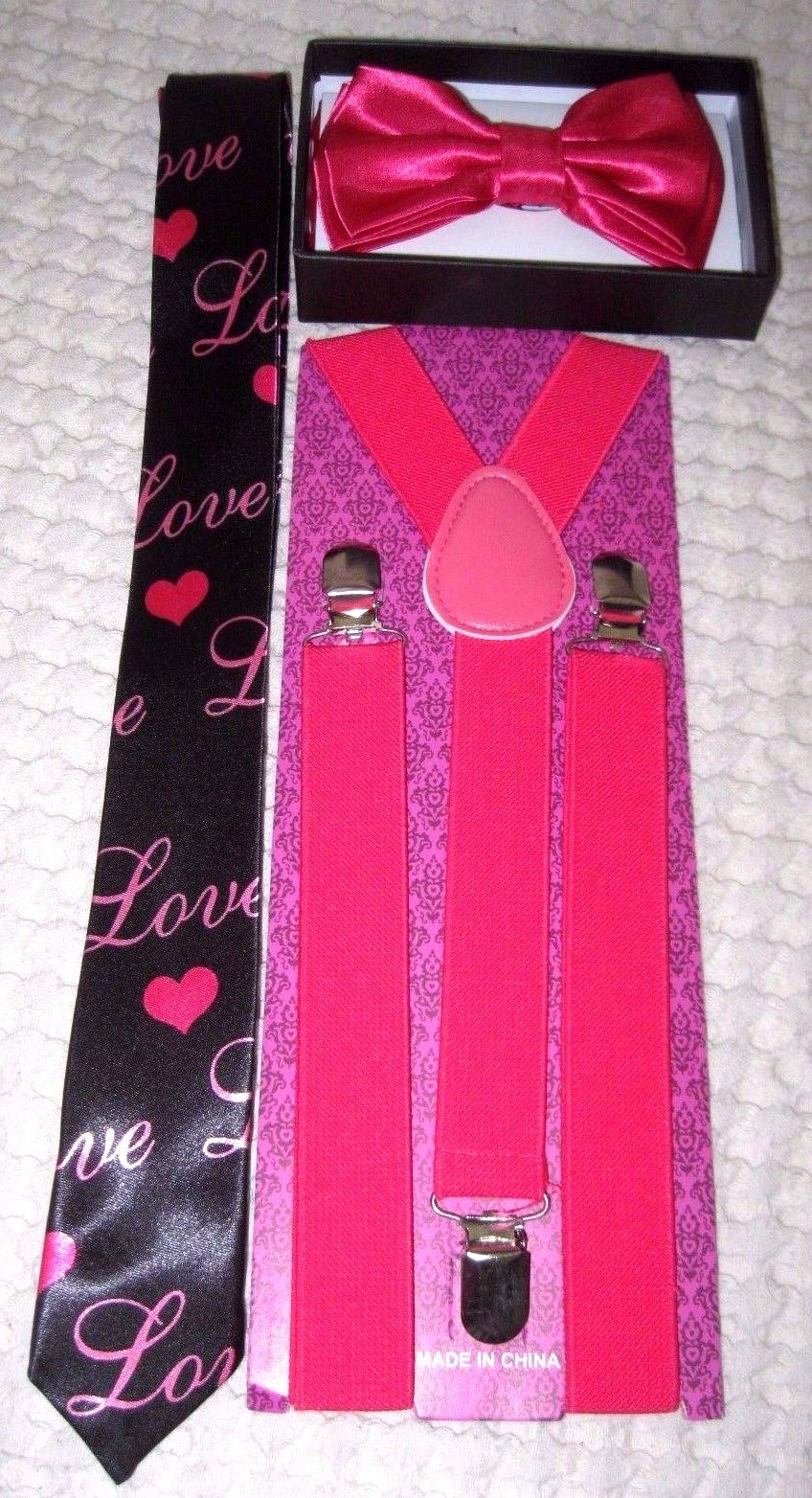• UNISEX FASHION SOLID SHINY HOT PINK ADJUSTABLE ALL POLYESTER SILK BOW TIE, PINK HEARTS AND LOVE NECKTIE, WITH AND SOLID HOT PINK ADJUSTABLE Y-BACK SUSPENDERS COMBO-NEW IN FACTORY BOX!