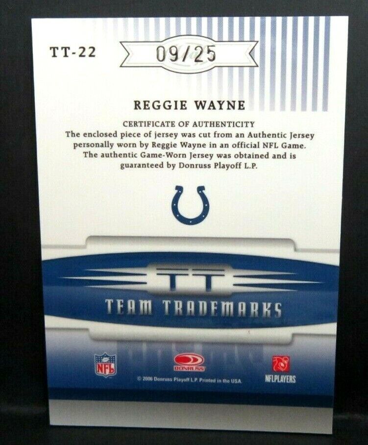 REGGIE WAYNE (INDIANAPOLIS COLTS-WR GOAT SUPERSTAR) 2006 LEAF LIMITED "RUNNING DOWN FIELD WITH BALL IN HAND POSE" NUMBERED 09/25 TEAM TRADEMARKS BLUE-COLORED GAME-USED JERSEY PATCH AUTOGRAPH CARD#TT-22 WHICH MAY BE NEAR-MINT OR BETTER CONDITION SINCE IT WENT FROM A PACK TO A TOPLOADER!