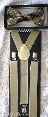 • UNISEX FASHION TAN BEIGE WHITE CHECKERED CHECKS DIAMONDS PLAID ADJUSTABLE ALL POLYESTER SILK BOW TIE AND TAN BEIGE SUSPENDERS COMBO-NEW IN FACTORY BOX!