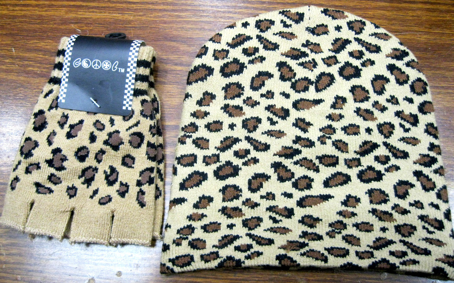 Tan Beige Leopard Animal Print Safari Beanie Ski Cap+Leopard Matching Gloves-New