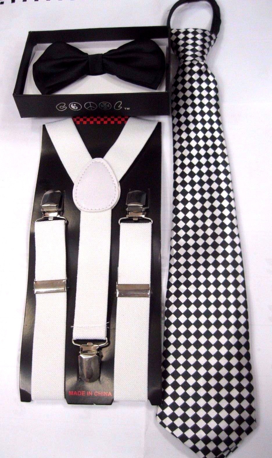 - UNISEX KID'S BOYS GIRLS FASHION SOLID BLACK TUXEDO ADJUSTABLE ALL POLYESTER SILK BOW TIE-NEW IN FACTORY BOX, BLACK AND WHITE CHECKERS DIAMONDS 14" PRE-TIED ADJUSTABLE NECK TIE, AND SOLID BRIGHT WHITE ADJUSTABLE Y-BACK SUSPENDERS!