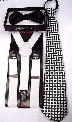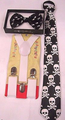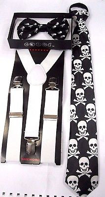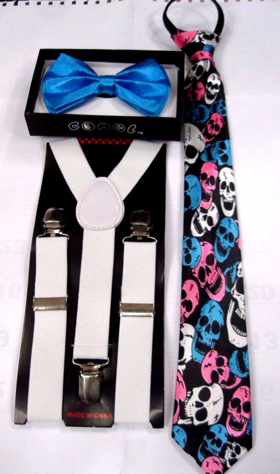 - UNISEX KID'S BOYS GIRLS FASHION SOLID BLUE TUXEDO ADJUSTABLE ALL POLYESTER SILK BOW TIE-NEW IN FACTORY BOX,MULTI-COLOR SKULLS 14" PRE-TIED ADJUSTABLE NECK TIE, AND SOLID BRIGHT WHITE ADJUSTABLE Y-BACK SUSPENDERS!