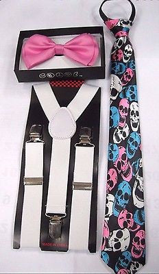 Teen's Pink Adjustable Bow Tie,Multi-Color Skulls Tie & White Y-Back Suspenders