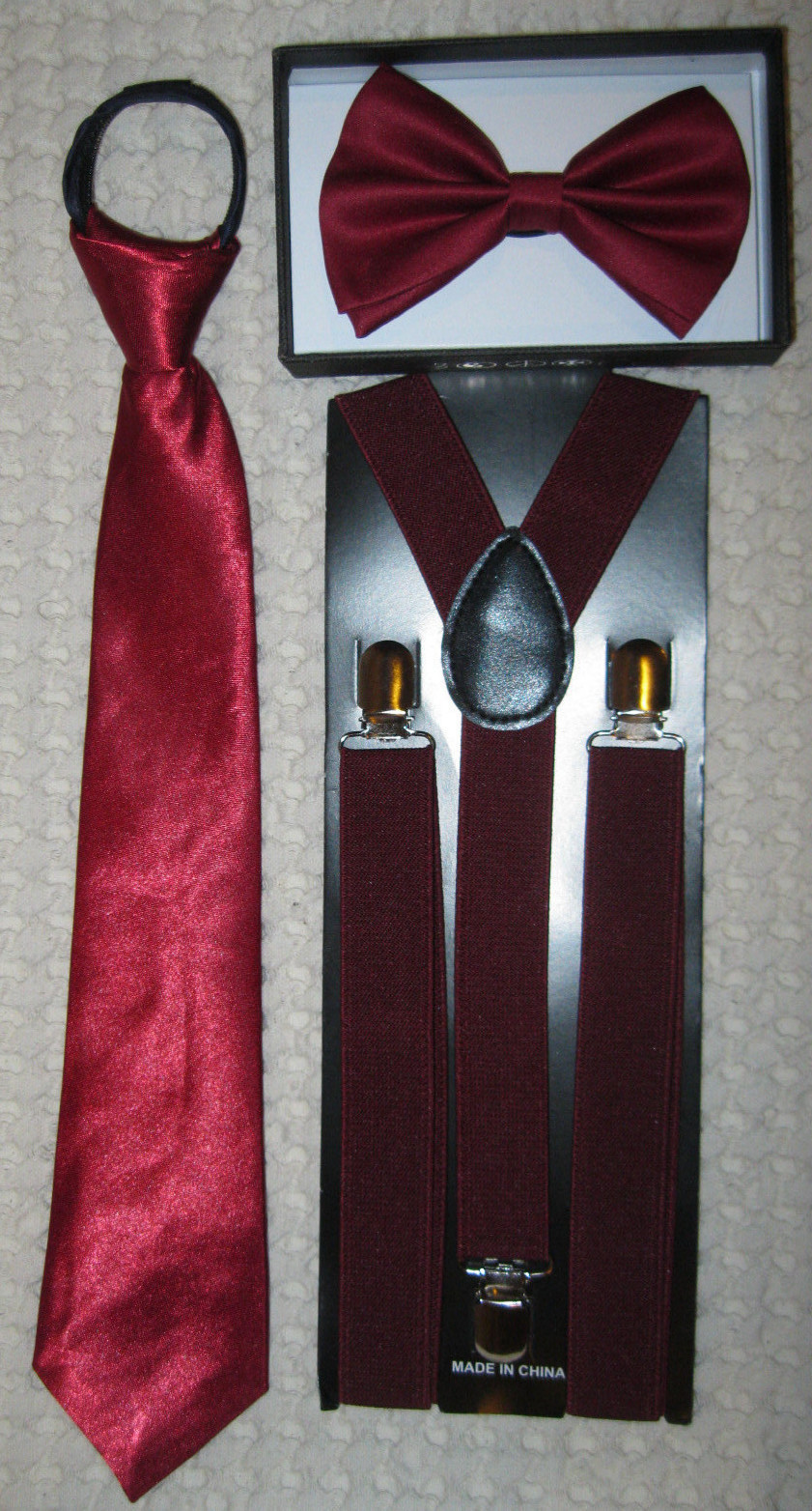 Teens Young Adults Burgundy Adj Bow Tie,Neck Tie & Burgundy Y-Back Suspenders