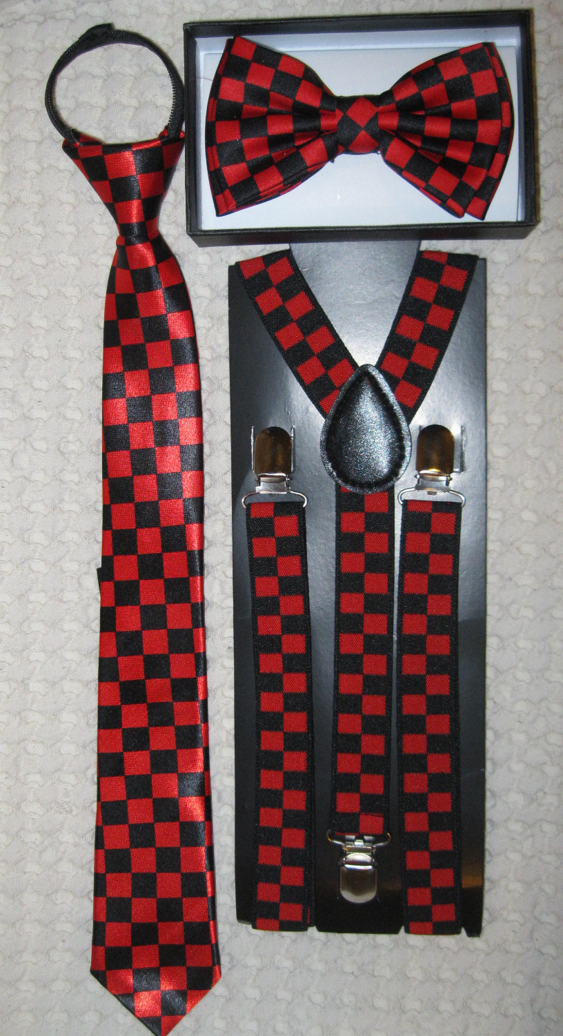 Teens Young Adults Red Checkers Bow Tie,Neck Tie & Red Black Checkers Suspenders