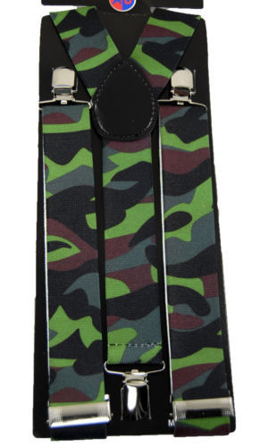 - BLACK AND GREEN CAMO CAMOUFLAGE HEAVY DUTY 1 1/2" WIDE Y-STYLE ADJUSTABLE SUSPENDERS-BRAND NEW FACTORY SEALED!