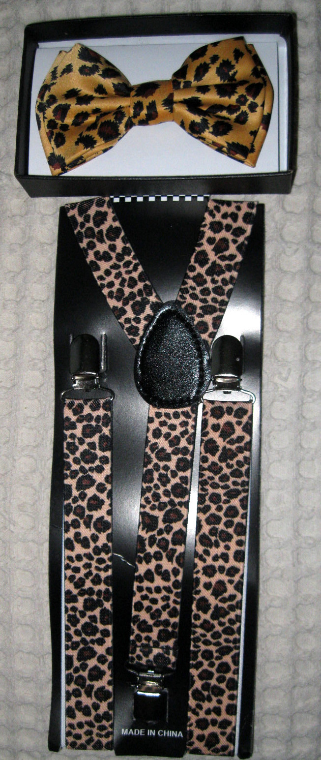 - UNISEX FASHION LEOPARD PRINT ADJUSTABLE ALL POLYESTER SILK BOWTIE AND SUSPENDERS COMBO-NEW IN FACTORY BOX!