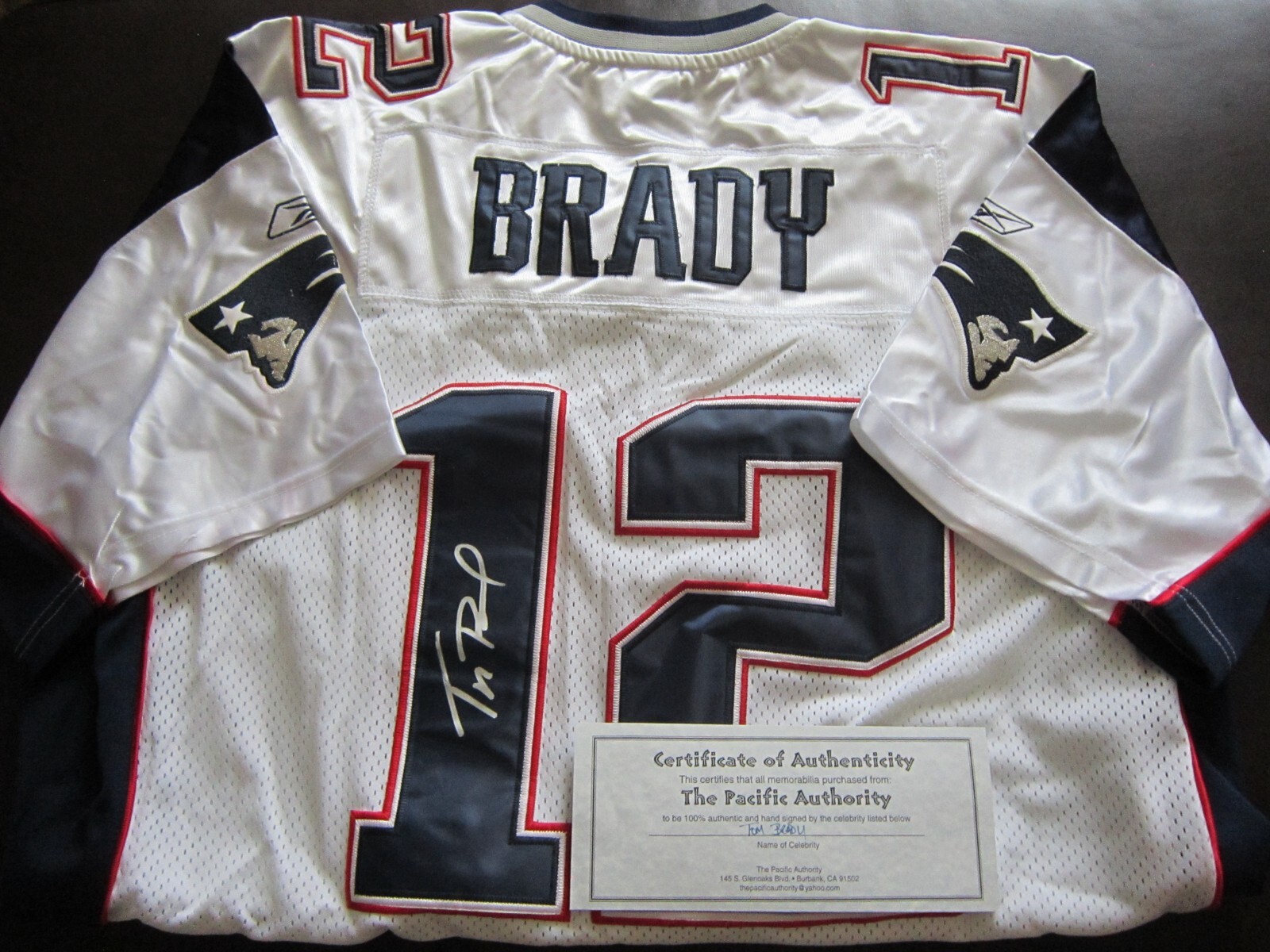 TOM BRADY HAND SIGNED IN SILVER SHARPIE OFFICIAL WHITE SEWN ON NAME,NUMBER,OFFICIAL NEW ENGLAND PATRIOTS#12 WHITE JERSEY WITH PACIFIC AUTHORITY AUTHENTICATION CERTIFICATION!!