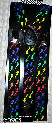 MULTI COLORED GUITARS ON BLACK HEAVY DUTY 1" WIDE Y-STYLE SUSPENDERS-BRAND NEW FACTORY SEALED!