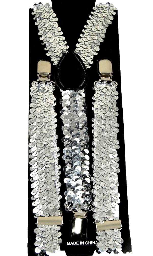 • UNISEX FASHION SILVER SEQUIN Y-SHAPE BACK ADJUSTABLE ALL POLYESTER SUSPENDERS COMBO-NEW IN FACTORY BOX!