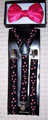 - UNISEX FASHION SOLID HOT PINK ADJUSTABLE ALL POLYESTER SILK BOW TIE AND SOLID BLACK WITH HOT PINK STARS 1" WIDE ADJUSTABLE SUSPENDERS COMBO-NEW IN FACTORY BOX!