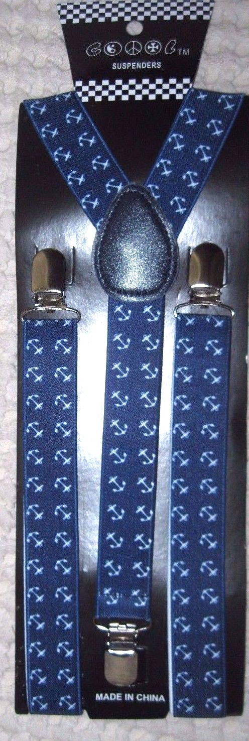 NAVY BLUE WITH WHITE ANCHORS HEAVY DUTY 1" WIDE Y-STYLE SUSPENDERS-BRAND NEW FACTORY SEALED!