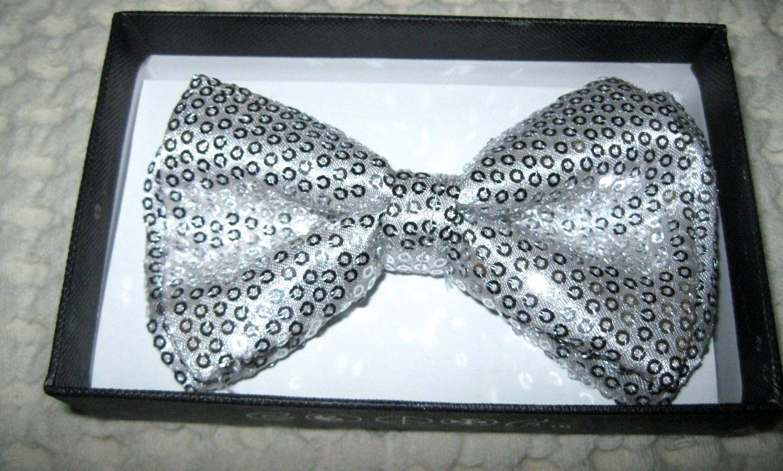 •UNISEX FASHION SILVER GRAY SEQUIN TUXEDO ADJUSTABLE ALL POLYESTER SILK BOWTIE-NEW IN FACTORY BOX!