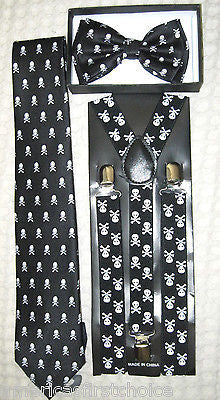 • UNISEX FASHION SOLID BLACK WITH WHITE SKULLS AND CROSSBONES ADJUSTABLE ALL POLYESTER SILK BOW TIE AND SOLID BLACK WITH WHITE SKULLS AND CROSSBONES NECK TIE COMBO-NEW IN FACTORY BOX!