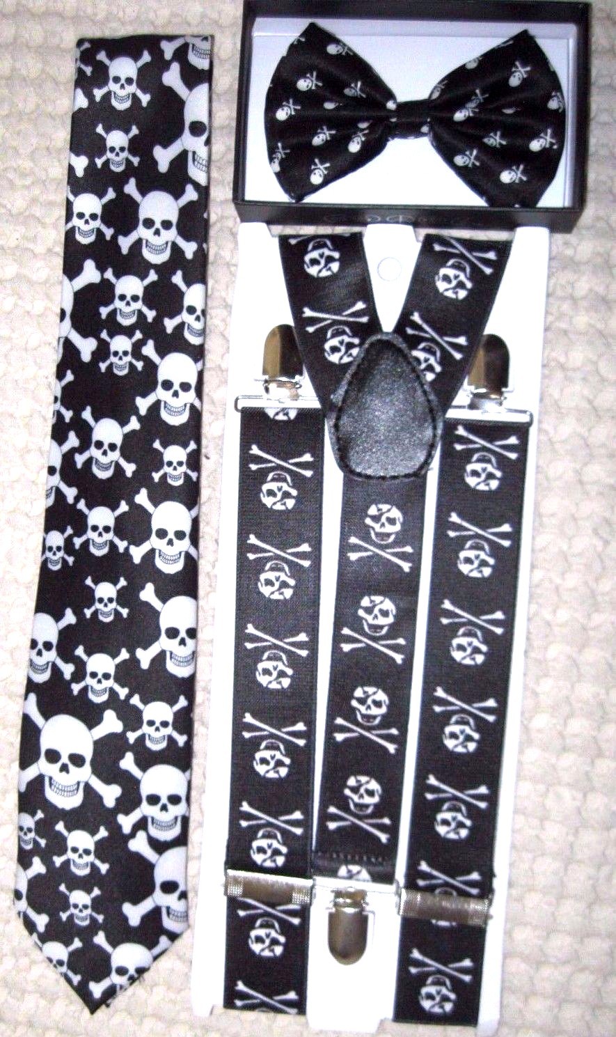 • UNISEX FASHION SOLID BLACK WITH WHITE SKULLS AND CROSSBONES ADJUSTABLE ALL POLYESTER SILK BOW TIE,SOLID BLACK WITH WHITE SKULLS AND CROSSBONES NECK TIE, AND SOLID BLACK WITH WHITE SKULLS AND CROSSBONES ADJUSTABLE SUSPENDERS COMBO-NEW IN FACTORY BOX!
