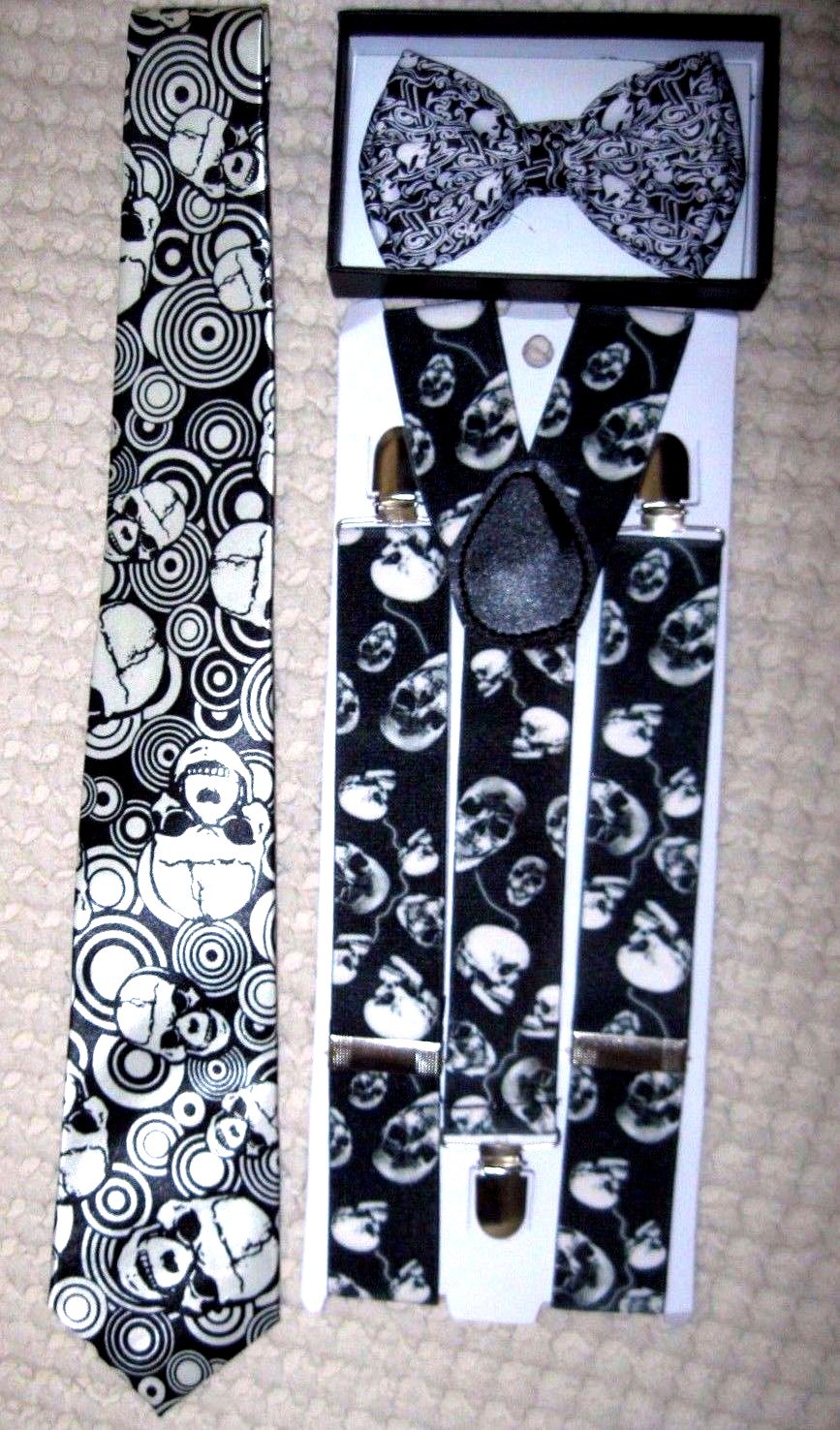 - UNISEX FASHION SOLID BLACK WITH WHITE SKULLS DESIGNS ADJUSTABLE ALL POLYESTER SILK BOW TIE,SOLID BLACK AND WHITE SKULLS DESIGN TIE, AND SOLID BLACK WITH WHITE SKULLS ADJUSTABLE SUSPENDERS COMBO-NEW IN FACTORY BOX!