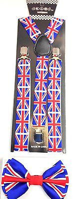 - UNISEX FASHION ENGLAND/BRITISH (RED/WHITE/BLUE) ADJUSTABLE ALL POLYESTER SILK BOWTIE AND SUSPENDERS COMBO-NEW IN FACTORY BOX!