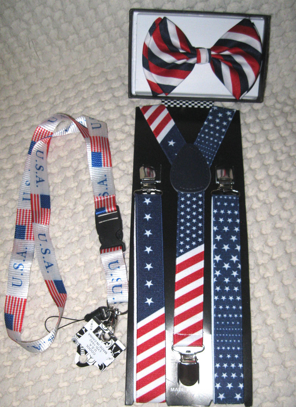 - UNISEX FASHION RED,WHITE,BLUE US PATRIOTIC STRIPES ADJUSTABLE ALL POLYESTER SILK BOW TIE,RED,WHITE,BLUE US PATRIOTIC FLAG LANYARD, AND RED,WHITE,BLUE US PATRIOTIC FLAG SUSPENDERS COMBO-NEW IN FACTORY BOX!