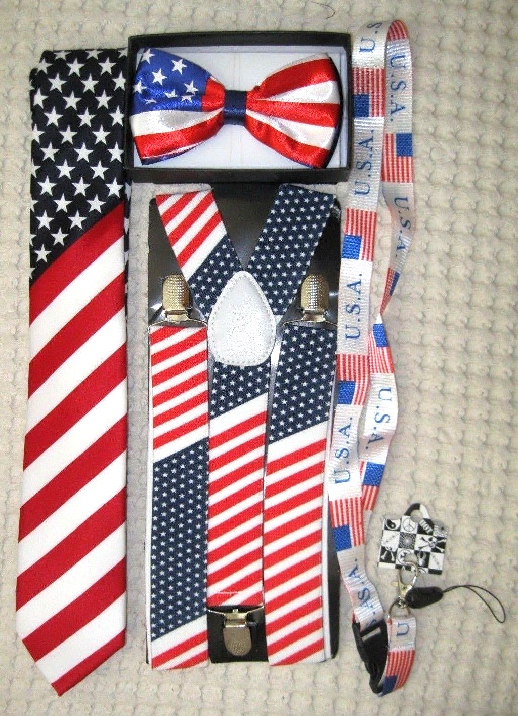 US Flag American Flag Suspenders,Lanyard,Tie &US Patriotic Flag Adj. Bow Tie-v10