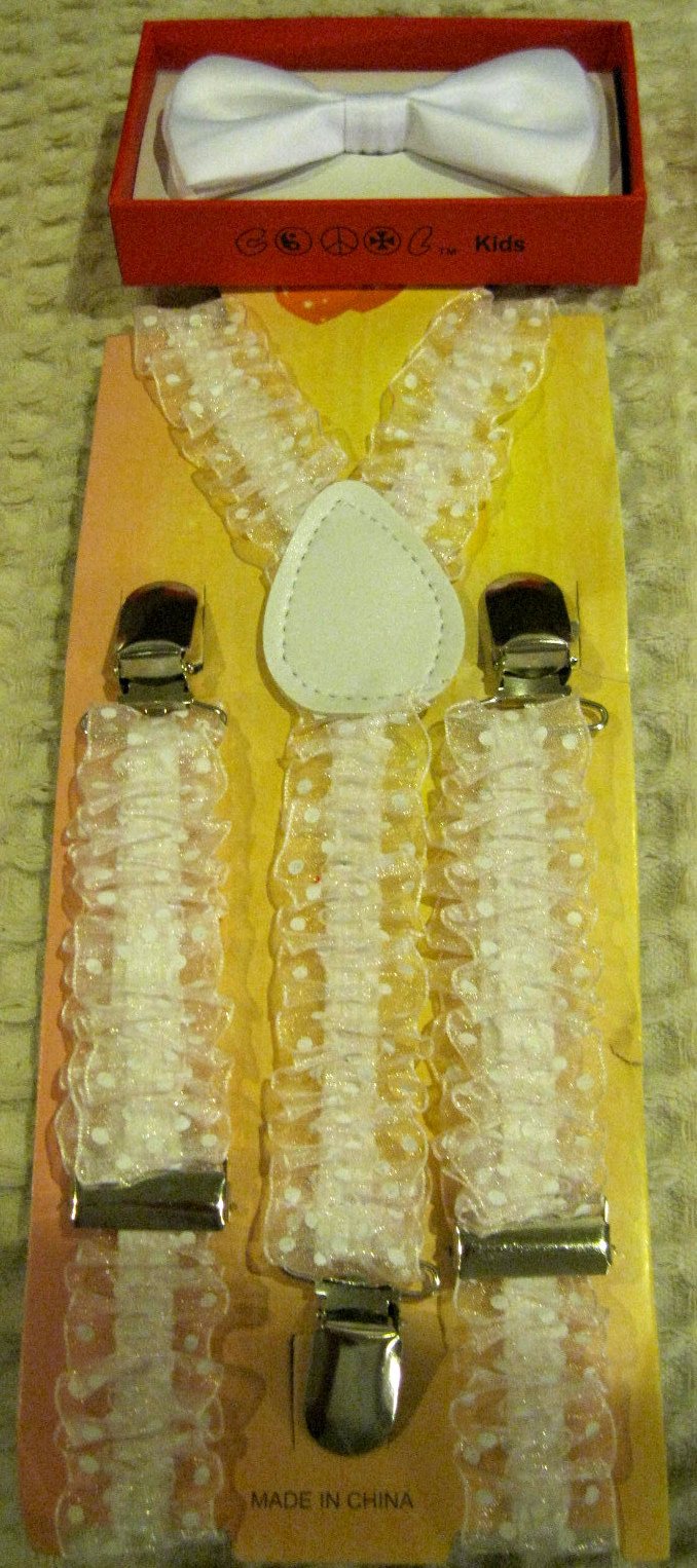 - UNISEX KID'S FASHION SOLID WHITE TUXEDO ADJUSTABLE ALL POLYESTER SILK BOW TIE-NEW IN FACTORY BOX AND SOLID WHITE AND LIGHT PINK LACE ADJUSTABLE SUSPENDERS!