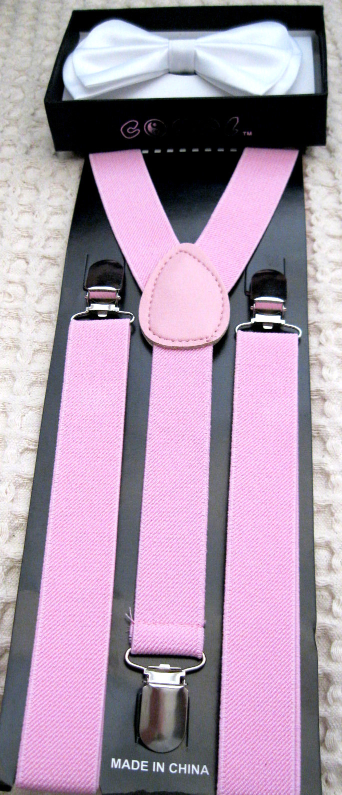 • UNISEX FASHION PLAIN WHITE TUXEDO ADJUSTABLE ALL POLYESTER SILK BOWTIE-NEW IN FACTORY BOX AND ROSE LIGHT PINK ADJUSTABLE SUSPENDERS COMBO!