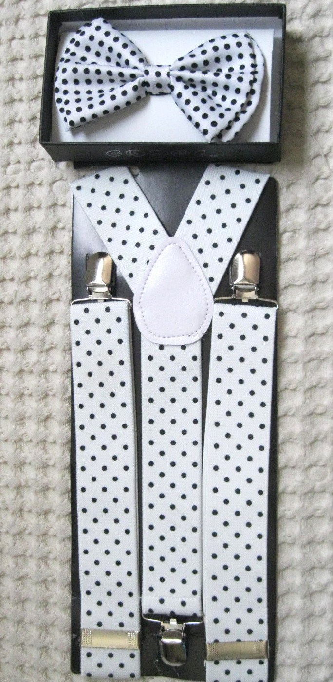 - UNISEX FASHION WHITE WITH BLACK POLKA DOT TUXEDO ADJUSTABLE ALL POLYESTER SILK BOW TIE-NEW IN FACTORY BOX AND WHITE WITH BLACK POLKA DOT ADJUSTABLE SUSPENDERS COMBO!